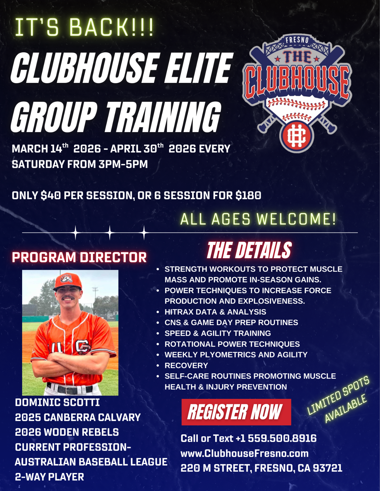 Upcoming Events Apr 18 ClubHouse Elite Group Training Saturday, April 18, 2026 3:00 PM 5:00 PM Google Calendar ICS Click Here to Register through GymMaster View Event → Apr 25 ClubHouse Elite Group Training Saturday, April 25, 2026 3:00 PM 5:00 PM Google Calendar ICS Click Here to Register through GymMaster View Event → Apr 11 ClubHouse Elite Group Training Saturday, April 11, 2026 3:00 PM 5:00 PM Google Calendar ICS Click Here to Register through GymMaster View Event → Apr 4 ClubHouse Elite Group Training Saturday, April 4, 2026 3:00 PM 5:00 PM Google Calendar ICS View Event → Mar 29 SKILLS CLINIC: BATTERY PERFORMANCE, CATCHERS, MENTAL GAME Sunday, March 29, 2026 5:00 PM 7:00 PM Google Calendar ICS View Event → Mar 28 SKILLS CLINIC: HITTING, FIELDING, AND MENTAL PERFORMANCE Saturday, March 28, 2026 6:00 PM 8:00 PM Google Calendar ICS View Event → Mar 28 CLUBHOUSE ELITE GROUP TRAINING Saturday, March 28, 2026 3:00 PM 5:00 PM Google Calendar ICS View Event → Mar 21 ClubHouse Elite Group Training Saturday, March 21, 2026 3:00 PM 5:00 PM Google Calendar ICS View Event → Mar 14 ClubHouse Elite Group Training Saturday, March 14, 2026 3:00 PM 5:00 PM Google Calendar ICS View Event →