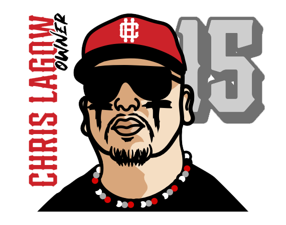 Illustration of a man wearing sunglasses, a red baseball cap, and a beaded necklace, with black streaks under his eyes, and the text "Rough Larry" and "Owner" beside him.